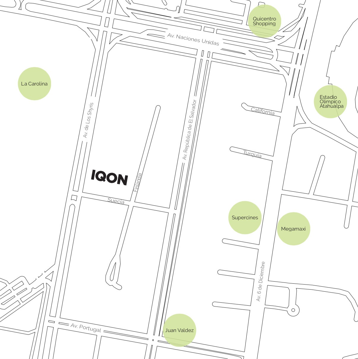 Centros Comerciales: CCI, CCNU, Quicentro Shopping, hoteles, bancos, restaurantes. Centros de Educación, Estadio Olímpico Atahualpa, Parque la Carolina, Estación del Metro, Corte Nacional de Justicia, entre otros.
