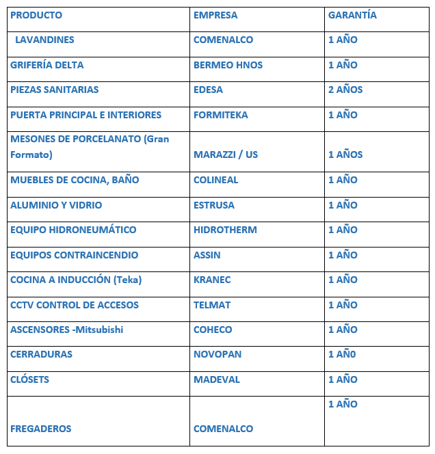 Garantía hasta 3 meses Esta garantía cubre los elementos que presenten mal funcionamiento o desgaste inusual bajo un uso adecuado de los mismos, y que no estén cubiertos por garantía directa de fábrica o del proveedor. Entre estos están: Hidráulicos: Llaves de paso, flotadores de inodoro, duchas, griferías, sifones, fugas, escapes de agua y taponamientos. Eléctricos: Cortos en boquillas, tomas de televisión, tomas de teléfono, citófono, breakers.